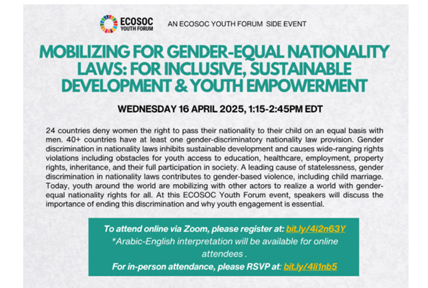The Global Alliance to End Statelessness co-sponsored a powerful side event at the ECOSOC Youth Forum, alongside Alliance members UNHCR, UNICEF, UN Women, and the Global Campaign for Equal Nationality Rights. Titled “Mobilizing for Gender-Equal Nationality Laws: For Inclusive, Sustainable Development & Youth Empowerment,” the event marked the official launch of the Youth Statement for Gender Equality in Nationality Laws, now open for signatures.